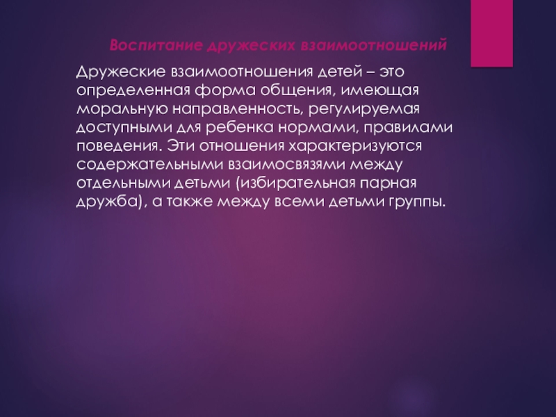 моральную направленность, регулируемая доступными для ребенка нормами, правилами поведения. Эти отношения характеризуются содержательными взаимосвязями между отдельными детьми (избирательная парная дружба), а также между всеми детьми группы.