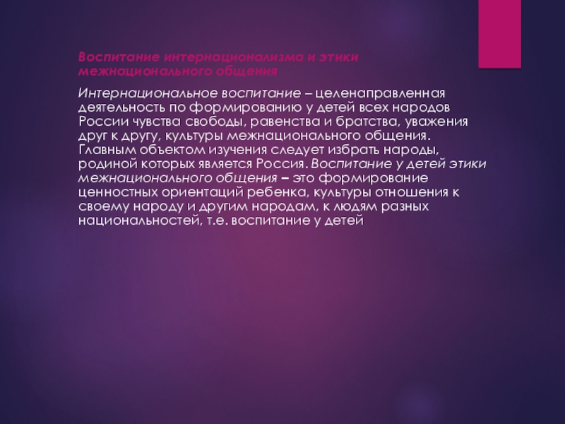 формированию у детей всех народов России чувства свободы, равенства и братства, уважения друг к другу, культуры межнационального общения. Главным объектом изучения следует избрать народы, родиной которых является Россия. Воспитание у детей этики межнационального общения – это формирование ценностных ориентаций ребенка, культуры отношения к своему народу и другим народам, к людям разных национальностей, т.е. воспитание у детей