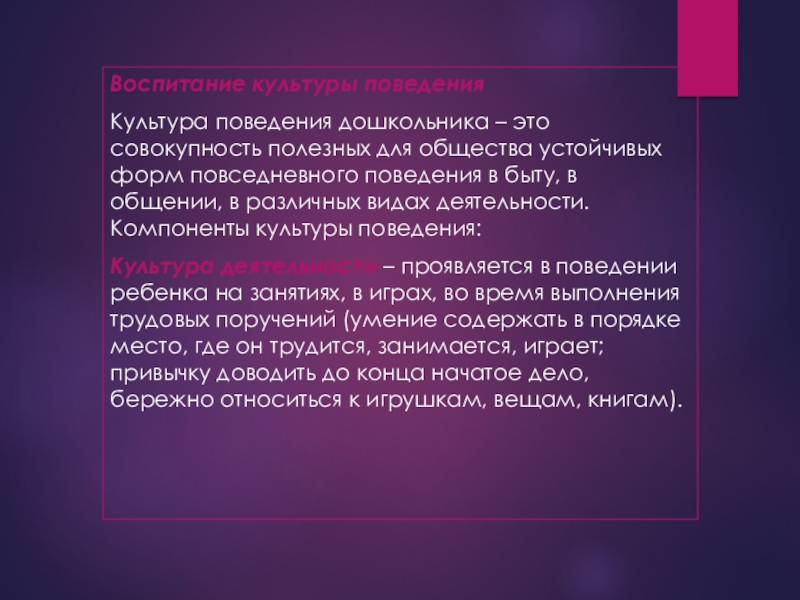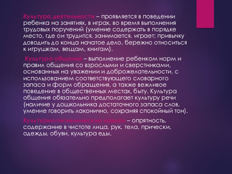 Культура деятельности – проявляется в поведении ребенка на занятиях, в играх, во время выполнения трудовых поручений (умение содержать в порядке место, где он трудится, занимается, играет; привычку доводить до конца начатое дело, бережно относиться к игрушкам, вещам, книгам).