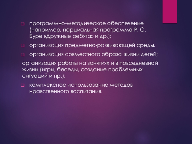 Слайд 8программно-методическое обеспечение (например, парциальная программа Р. С. Буре «Дружные ребята» и