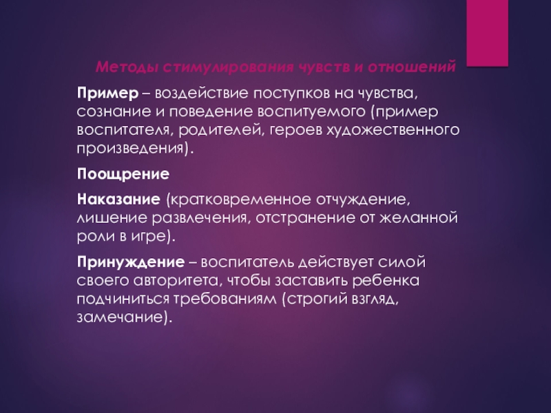 Принуждение – воспитатель действует силой своего авторитета, чтобы заставить ребенка подчиниться требованиям (строгий взгляд, замечание).