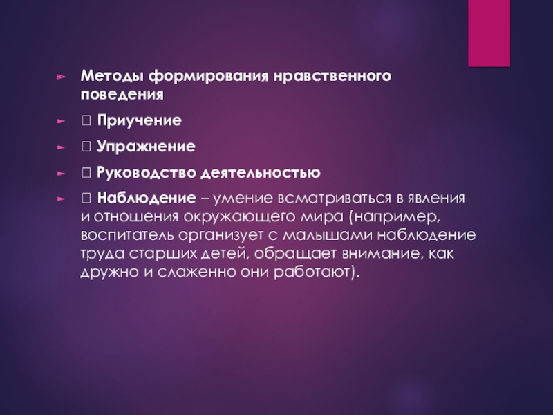 всматриваться в явления и отношения окружающего мира (например, воспитатель организует с малышами наблюдение труда старших детей, обращает внимание, как дружно и слаженно они работают).