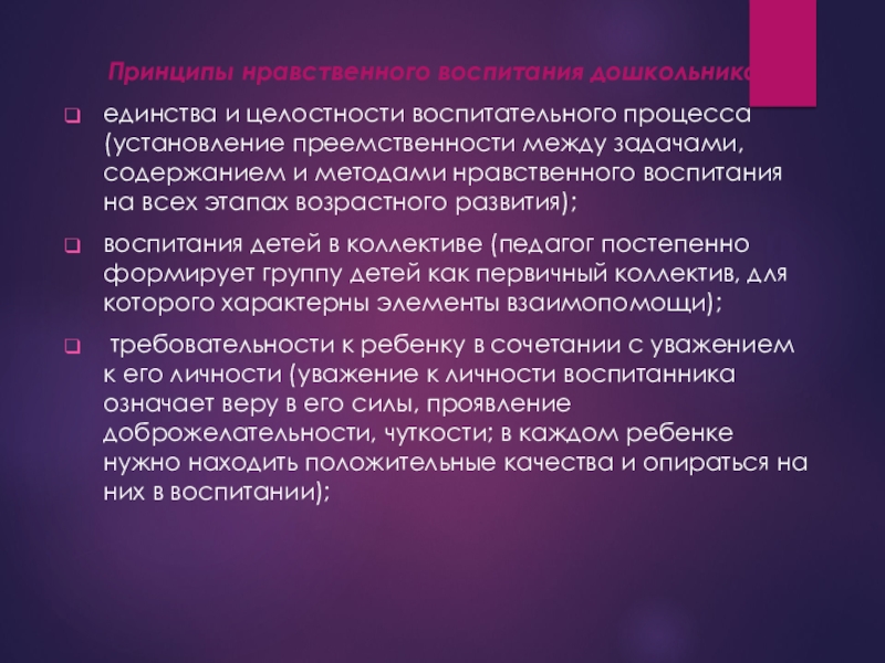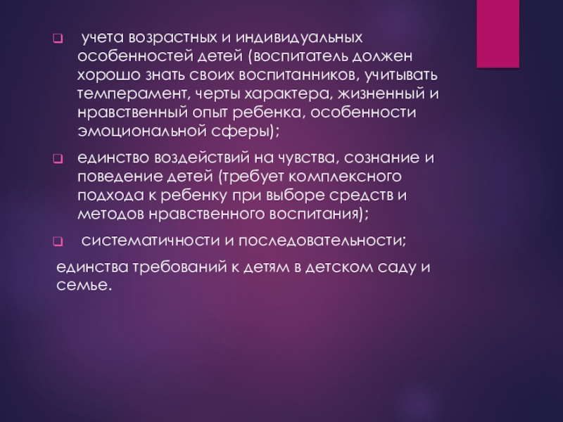 единство воздействий на чувства, сознание и поведение детей (требует комплексного подхода к ребенку при выборе средств и методов нравственного воспитания);