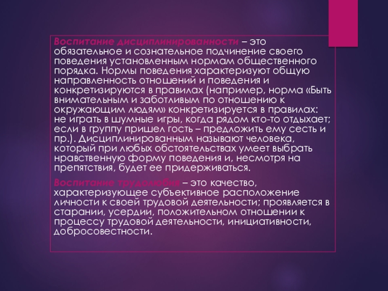 Слайд 16Воспитание дисциплинированности – это обязательное и сознательное подчинение своего поведения установленным