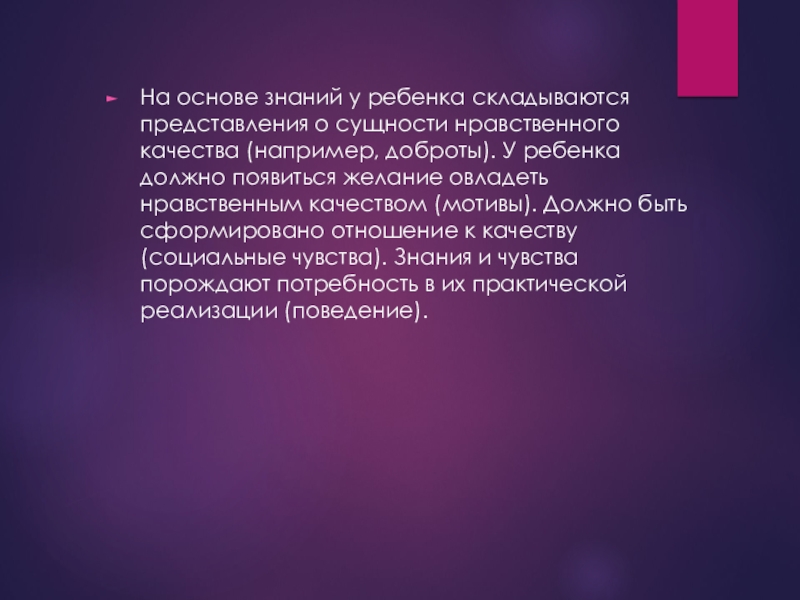 Слайд 3На основе знаний у ребенка складываются представления о сущности нравственного качества