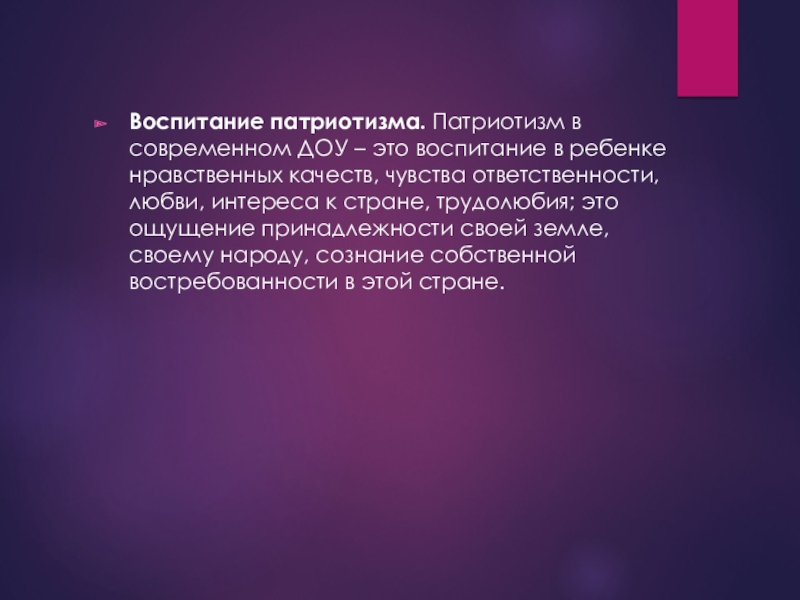Слайд 17Воспитание патриотизма. Патриотизм в современном ДОУ – это воспитание в ребенке