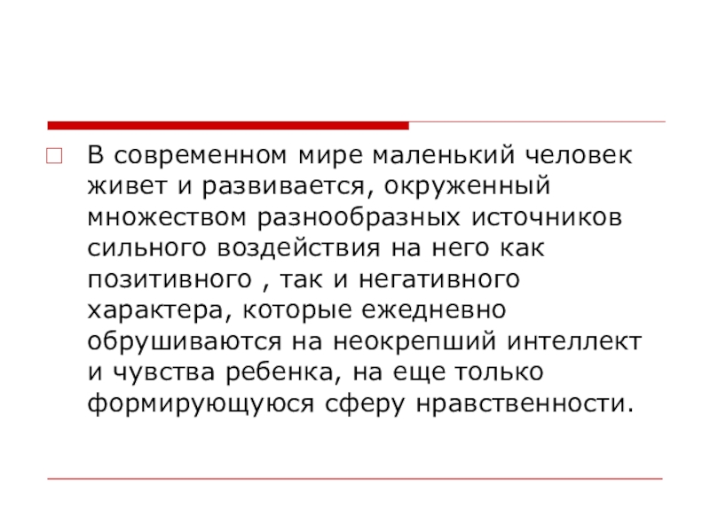 источников сильного воздействия на него как позитивного , так и негативного характера, которые ежедневно обрушиваются на неокрепший интеллект и чувства ребенка, на еще только формирующуюся сферу нравственности.