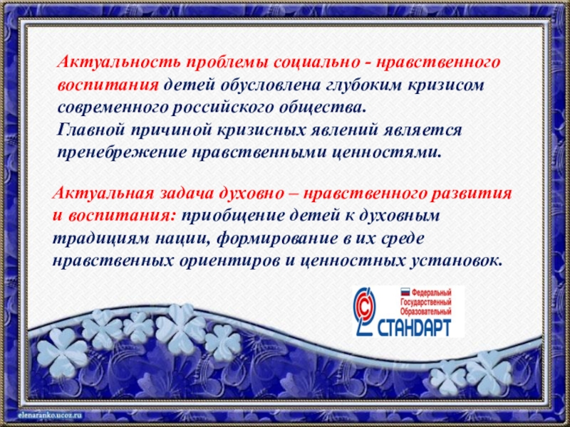 Актуальная задача духовно – нравственного развития и воспитания: приобщение детей к духовным традициям нации, формирование в их среде нравственных ориентиров и ценностных установок.