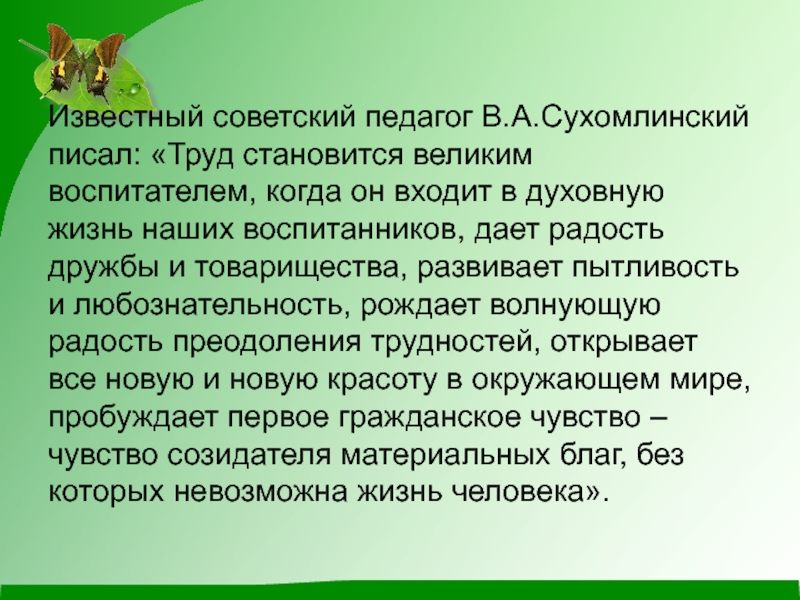 Слайд 2Известный советский педагог В.А.Сухомлинский писал: «Труд становится великим воспитателем, когда он