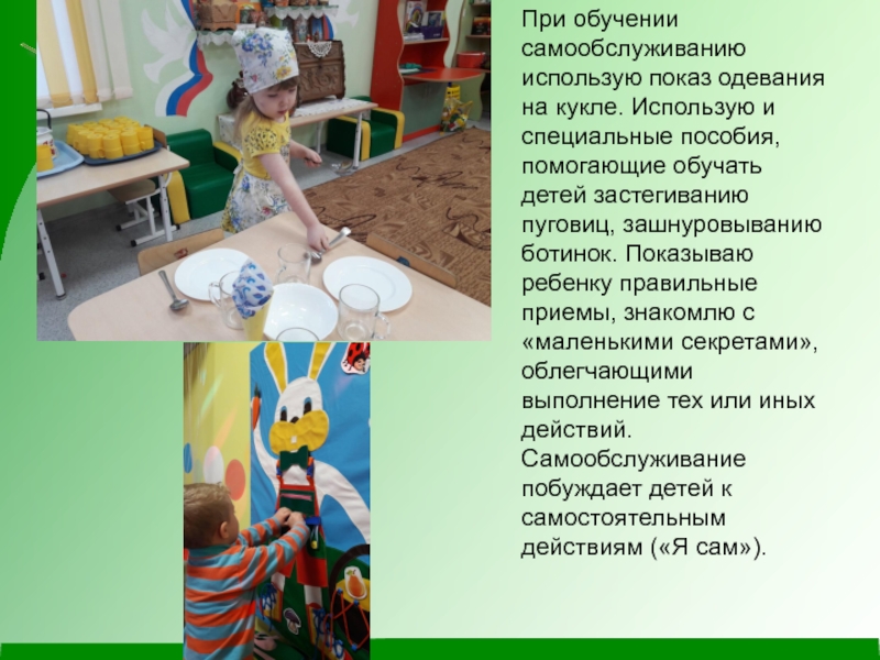 Слайд 6При обучении самообслуживанию использую показ одевания на кукле. Использую и специальные