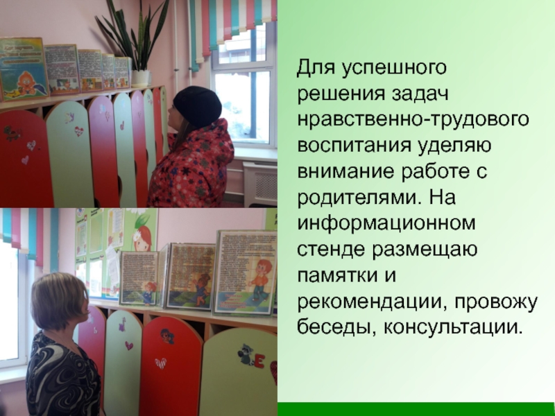 Слайд 10Для успешного решения задач нравственно-трудового воспитания уделяю внимание работе с родителями.
