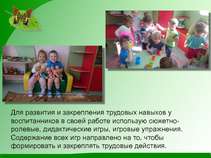 использую сюжетно-ролевые, дидактические игры, игровые упражнения. Содержание всех игр направлено на то, чтобы формировать и закреплять трудовые действия.