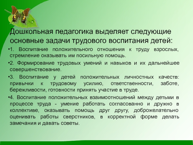 Слайд 3Дошкольная педагогика выделяет следующие основные задачи трудового воспитания детей: