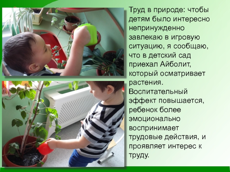 ситуацию, я сообщаю, что в детский сад приехал Айболит, который осматривает растения. Воспитательный эффект повышается, ребенок более эмоционально воспринимает трудовые действия, и проявляет интерес к труду.