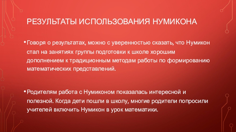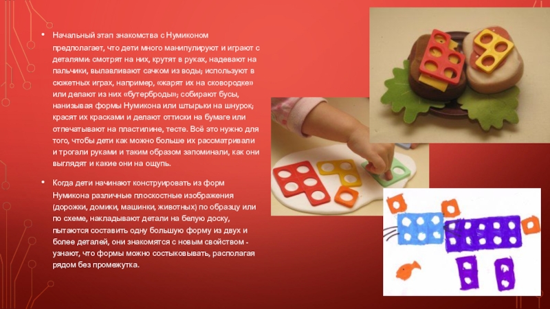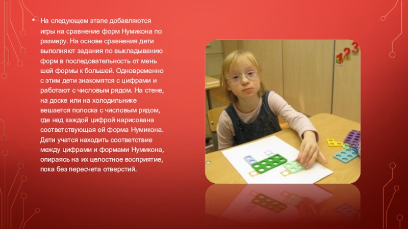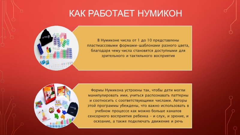 Нумикон позволяет задействовать сильные стороны маленьких детей - способности обучаться в практической деятельности, усваивать опыт в ходе простого наблюдения и запоминать, а затем узнавать при следующих предъявлениях стандартные образцы или шаблоны.