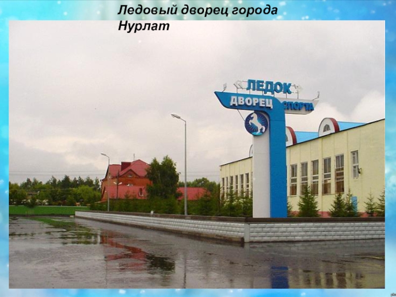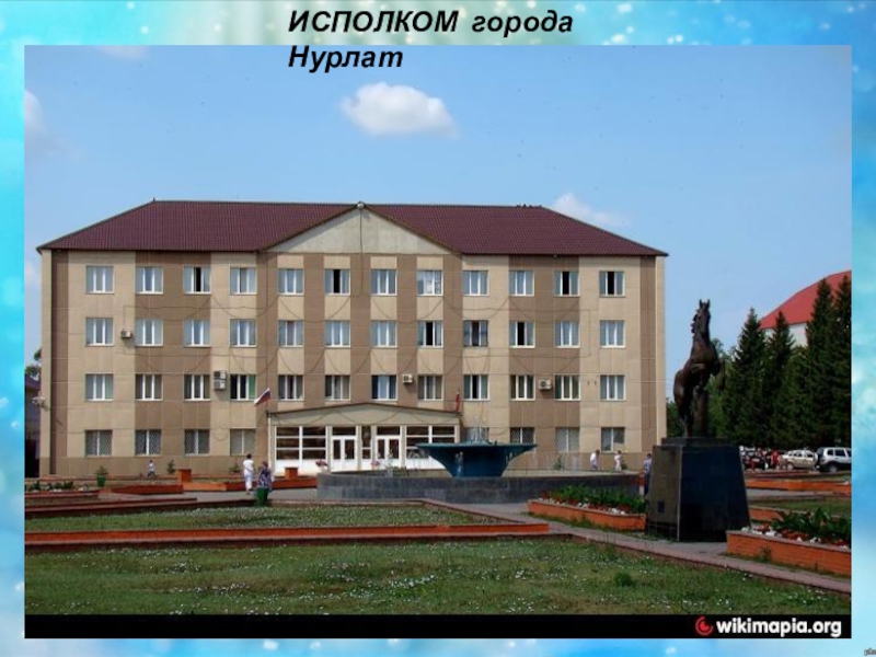 Скульптура коня – призера города Нурлат – на первом планеДворец культуры города Нурлат - на втором плане