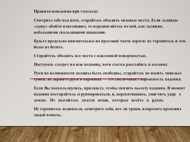 места. Если ледяную «лужу» обойти невозможно, то передвигайтесь по ней, как лыжник, небольшими скользящими шажками.