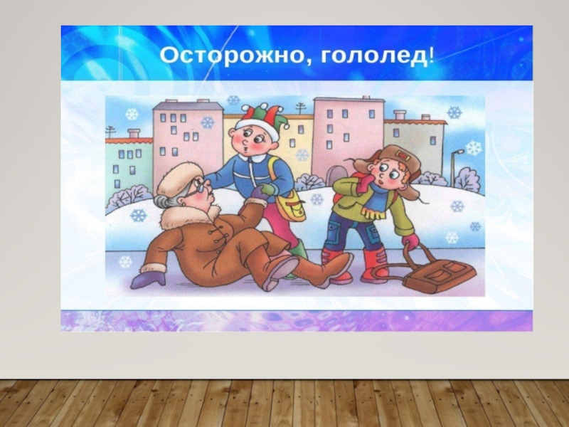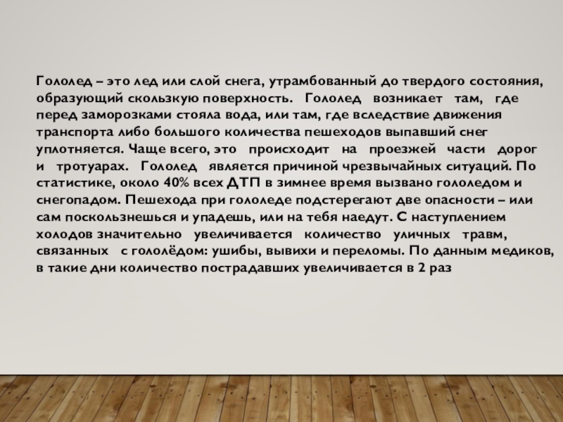образующий скользкую поверхность. Гололед возникает там, где перед заморозками стояла вода, или там, где вследствие движения транспорта либо большого количества пешеходов выпавший снег уплотняется. Чаще всего, это происходит на проезжей части дорог и тротуарах. Гололед является причиной чрезвычайных ситуаций. По статистике, около 40% всех ДТП в зимнее время вызвано гололедом и снегопадом. Пешехода при гололеде подстерегают две опасности – или сам поскользнешься и упадешь, или на тебя наедут. С наступлением холодов значительно увеличивается количество уличных травм, связанных с гололёдом: ушибы, вывихи и переломы. По данным медиков, в такие дни количество пострадавших увеличивается в 2 раз