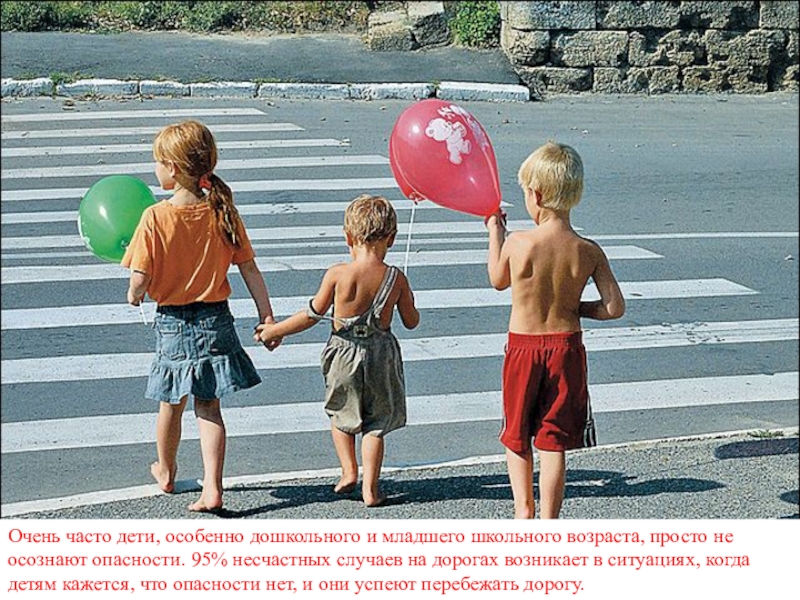 осознают опасности. 95% несчастных случаев на дорогах возникает в ситуациях, когда детям кажется, что опасности нет, и они успеют перебежать дорогу.