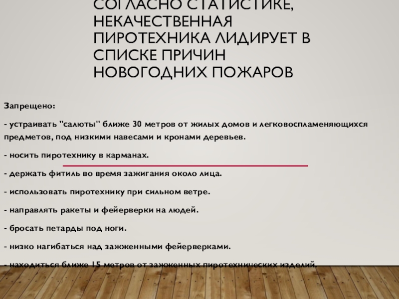 устраивать "салюты" ближе 30 метров от жилых домов и легковоспламеняющихся предметов, под низкими навесами и кронами деревьев.