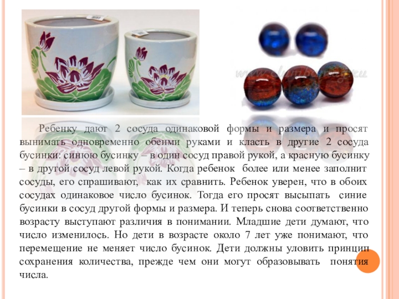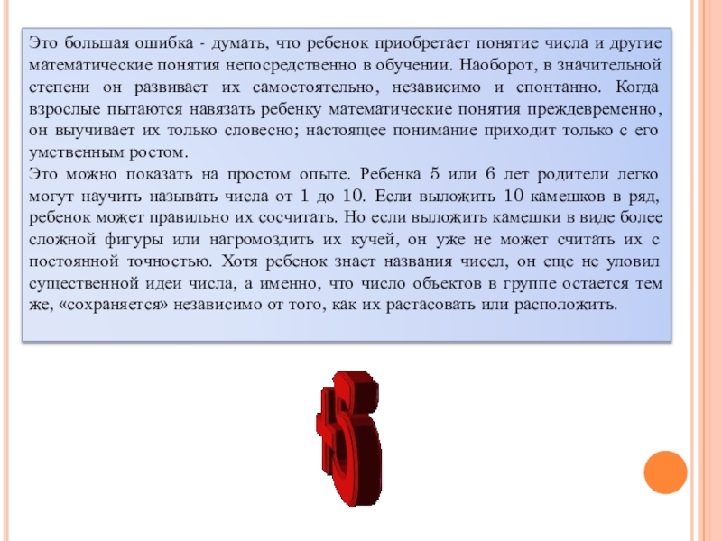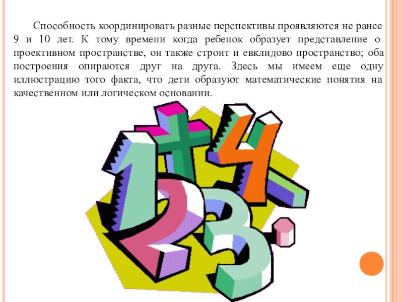 Последнее открытие содержит две новые логические операции. Первая – это процесс разделения, который позволяет ребенку понять, что целое состоит их некоторого числа сложенных вместе частей. Вторая – это операция смещения или замещения, которая позволяет ему присоединять одну часть к другой и таким путем создавать систему единиц. Измерение есть синтез разделения на части и замещение.
