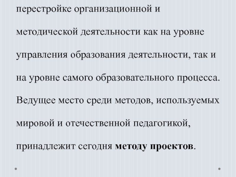 на уровне управления образования деятельности, так и на уровне самого образовательного процесса. Ведущее место среди методов, используемых мировой и отечественной педагогикой, принадлежит сегодня методу проектов.