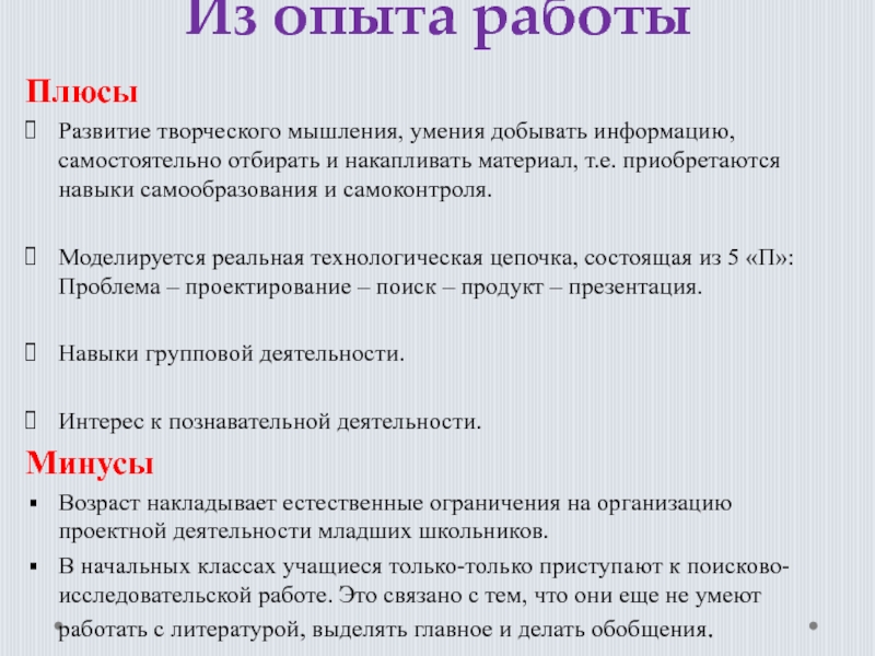 Из опыта работыПлюсы Развитие творческого мышления, умения добывать информацию, самостоятельно отбирать и накапливать материал, т.е. приобретаются навыки