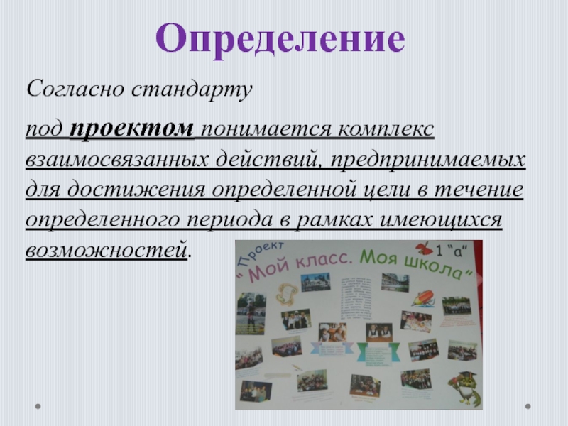 ОпределениеСогласно стандарту под проектом понимается комплекс взаимосвязанных действий, предпринимаемых для достижения определенной цели в течение определенного периода