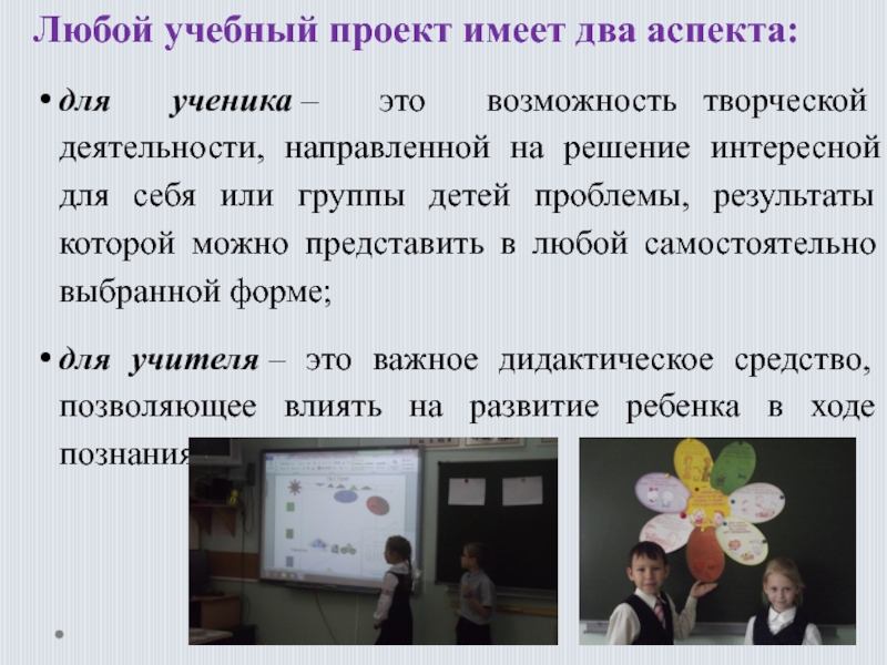 Любой учебный проект имеет два аспекта:для ученика – это возможность   творческой деятельности, направленной на решение интересной для себя или