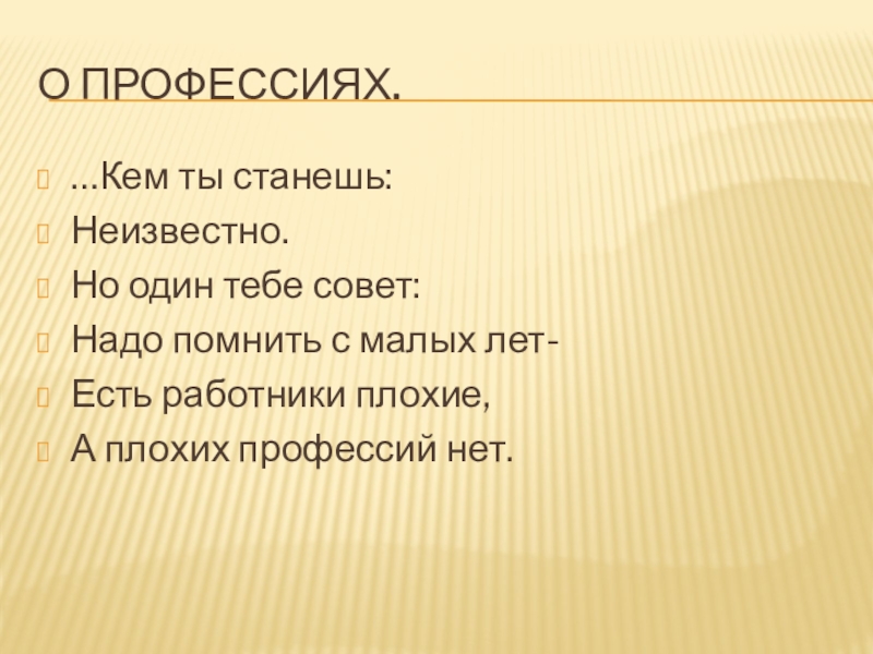 О профессиях.…Кем ты станешь:Неизвестно.Но один тебе совет:Надо помнить с малых лет-Есть работники плохие,А плохих профессий нет.
