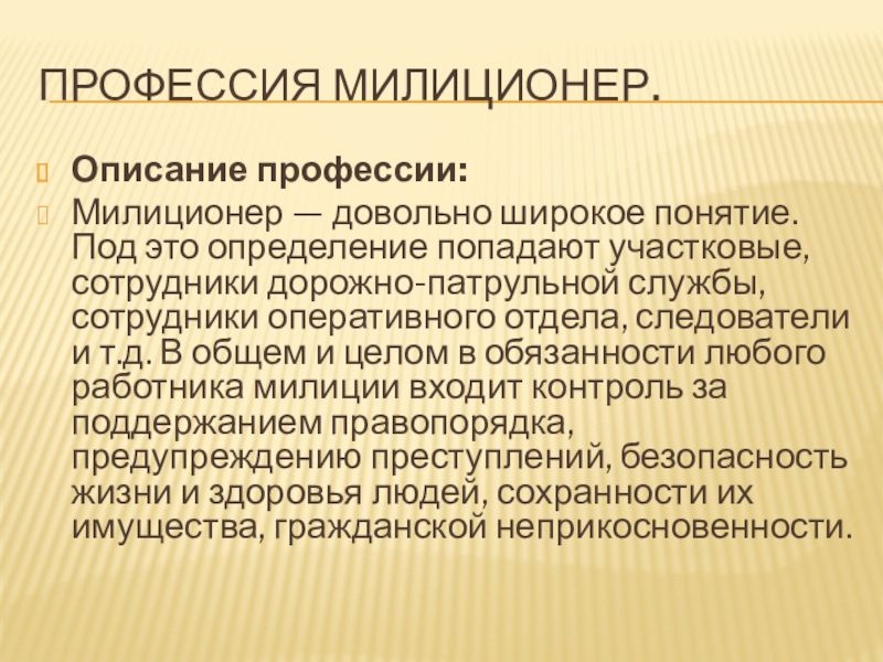 Профессия милиционер.Описание профессии:Милиционер — довольно широкое понятие. Под это определение попадают участковые, сотрудники дорожно-патрульной службы, сотрудники оперативного
