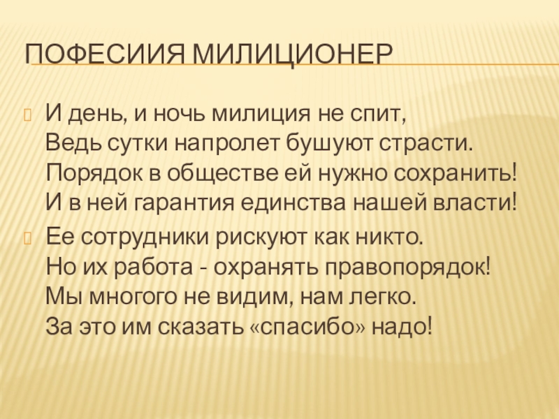 Пофесиия милиционерИ день, и ночь милиция не спит,  Ведь сутки напролет бушуют страсти.  Порядок в