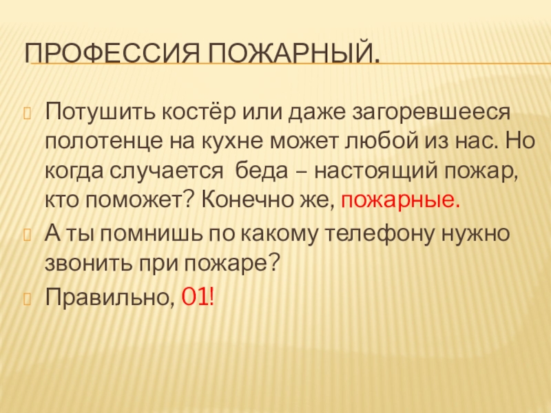из нас. Но когда случается беда – настоящий пожар, кто поможет? Конечно же, пожарные.