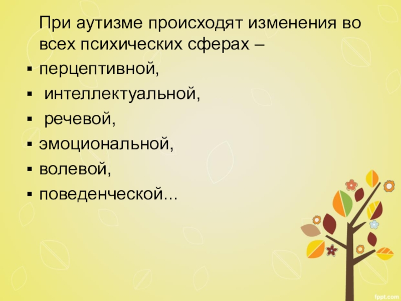 Слайд 14 При аутизме происходят изменения во всех психических сферах –