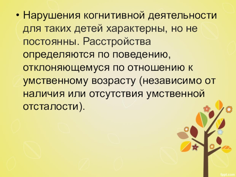 Слайд 4Нарушения когнитивной деятельности для таких детей характерны, но не постоянны. Расстройства
