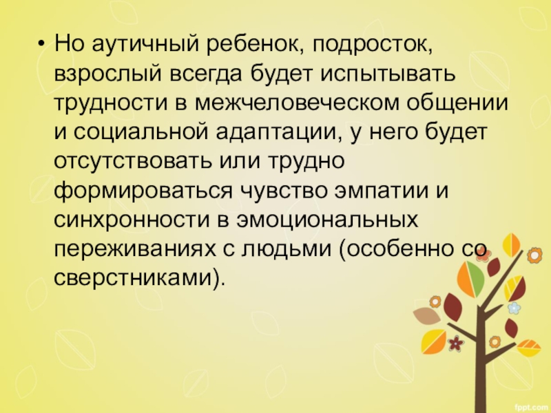 Слайд 16Но аутичный ребенок, подросток, взрослый всегда будет испытывать трудности в межчеловеческом