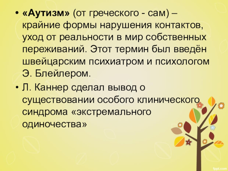 Слайд 5«Аутизм» (от греческого - сам) –крайние формы нарушения контактов, уход от
