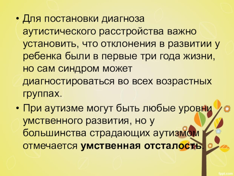 Слайд 17Для постановки диагноза аутистического расстройства важно установить, что отклонения в развитии