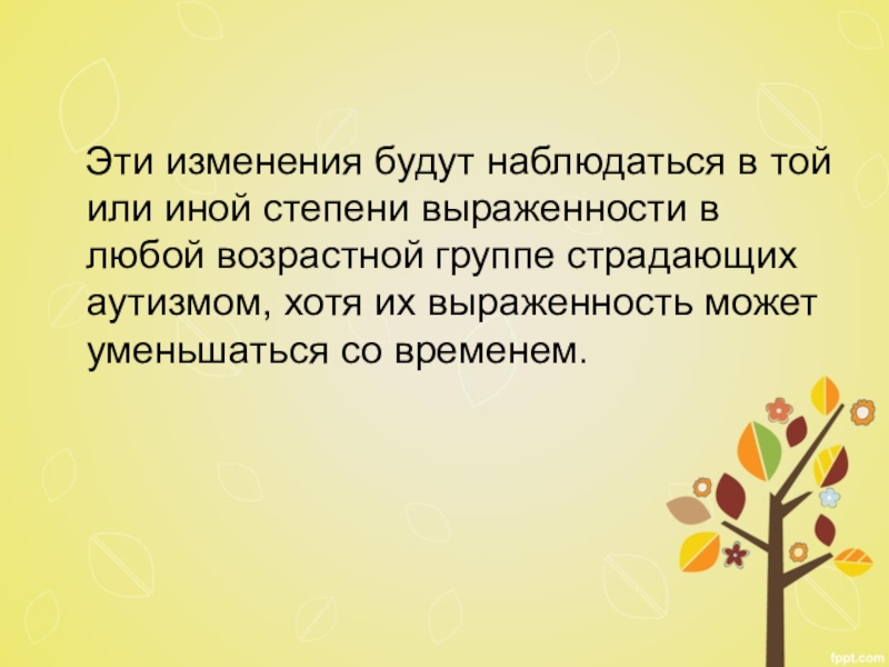 выраженности в любой возрастной группе страдающих аутизмом, хотя их выраженность может уменьшаться со временем.