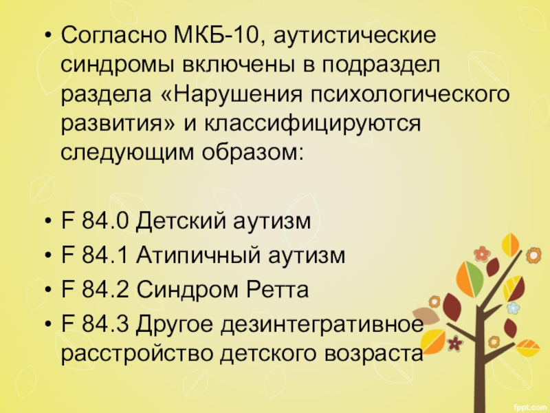 Слайд 10Согласно МКБ-10, аутистические синдромы включены в подраздел раздела «Нарушения психологического развития»