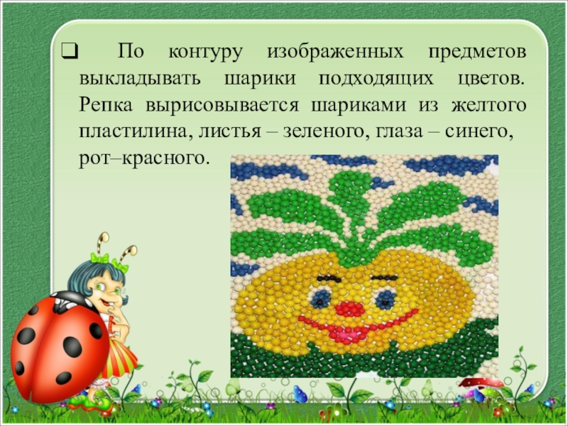 Слайд 5 По контуру изображенных предметов выкладывать шарики подходящих цветов. Репка вырисовывается