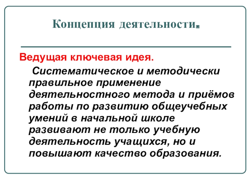 не овладевший приёмами учебной деятельности в начальных классах школы, в среднем звене неизбежно переходит в разряд неуспевающих. Обучение через деятельностный метод предусматривает такое осуществление учебного процесса, при котором на каждом этапе образования одновременно формируется и совершенствуется целый ряд интеллектуальных качеств личности.
