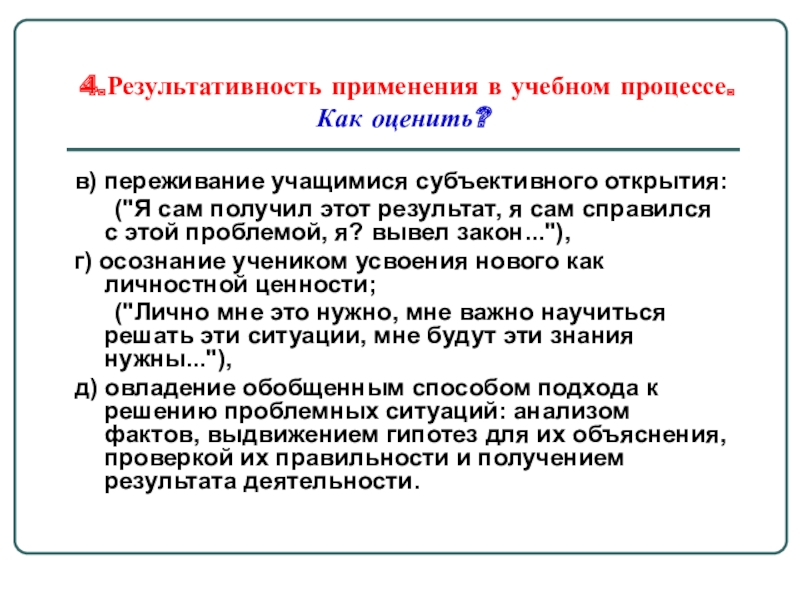 Проверка гипотез приводит учащегося к тому, что проблемная ситуация для ученика становится проблемой (и соответственно, задачей продуктивного типа), либо — превращается в репродуктивную задачу, которую нужно решить путем преобразования определенных условий.