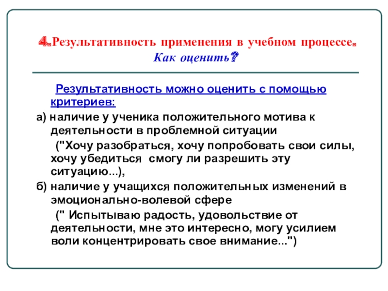 эмоциональный отклик учащихся на процесс познания, мотивация учебной деятельности, интерес к овладению новыми знаниями, умениями и практическому их применению. Всё это способствует развитию творческих способностей школьников, устной речи, умения формулировать и высказывать свою точку зрения, активизирует мышление.