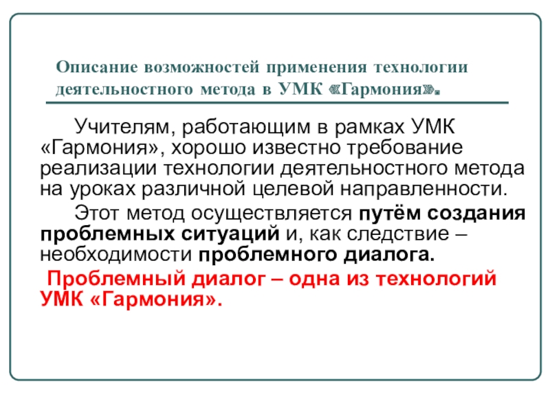 Реализация программы УМК«Гармония» через использование деятельностного подхода и проблемно – диалогического