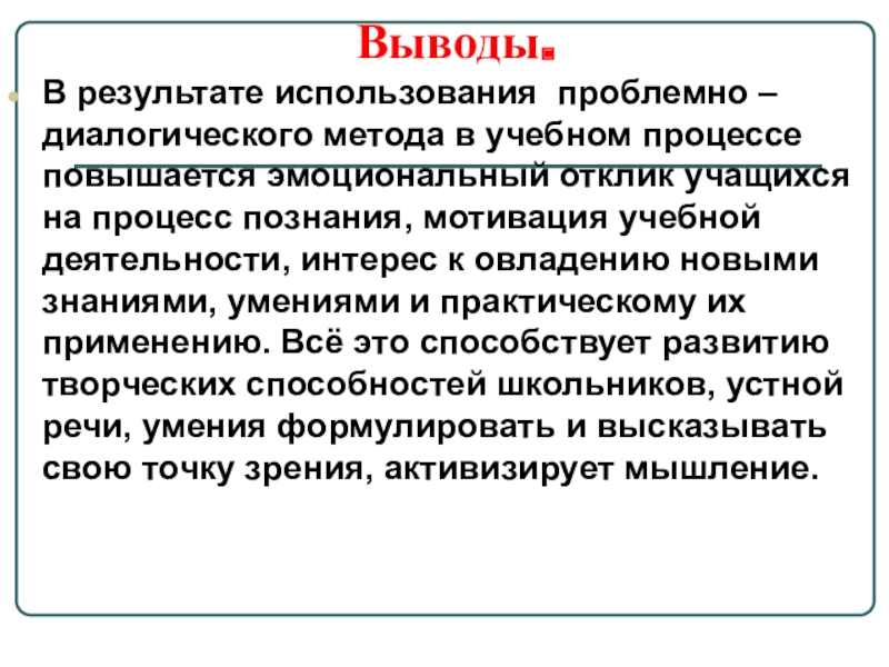 В результате использования проблемно – диалогического метода в учебном процессе повышается