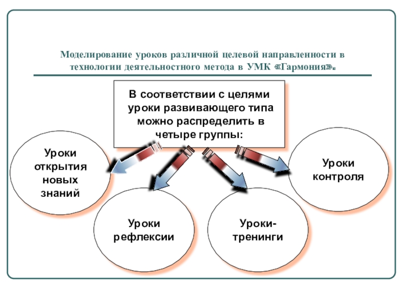 Слайд 27Моделирование уроков различной целевой направленности в технологии деятельностного метода в УМК