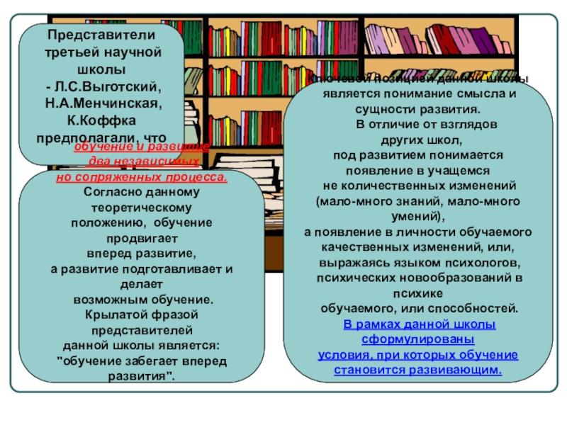 70 лет назад Л.С. Выготский в работе "Педагогическая психология" проанализировал и выделил три научные школы, которые по-разному решали вопрос о соотношении обучения и развития.