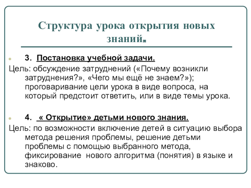 («Почему возникли затруднения?», «Чего мы ещё не знаем?»); проговаривание цели урока в виде вопроса, на который предстоит ответить, или в виде темы урока.