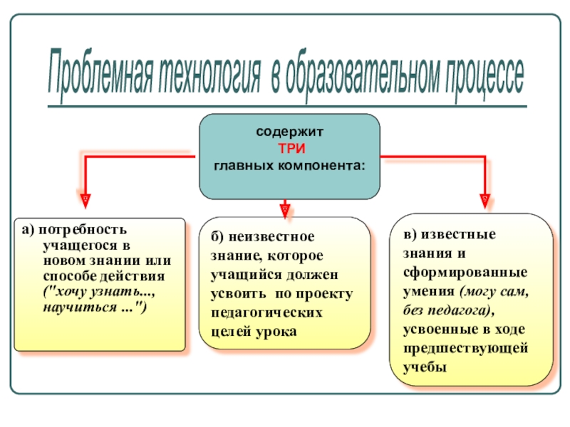 Проблемная ситуация включает в себя положение, содержащее противоречие и не имеющее однозначного решения; особое психологическое состояние познающей личности, характеризующееся возникновением познавательной потребности